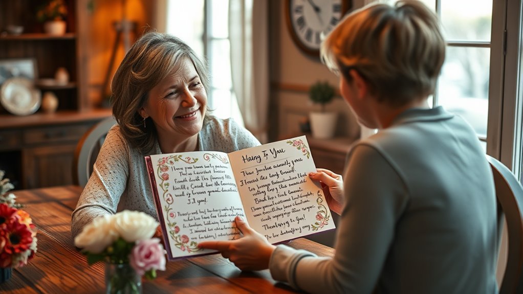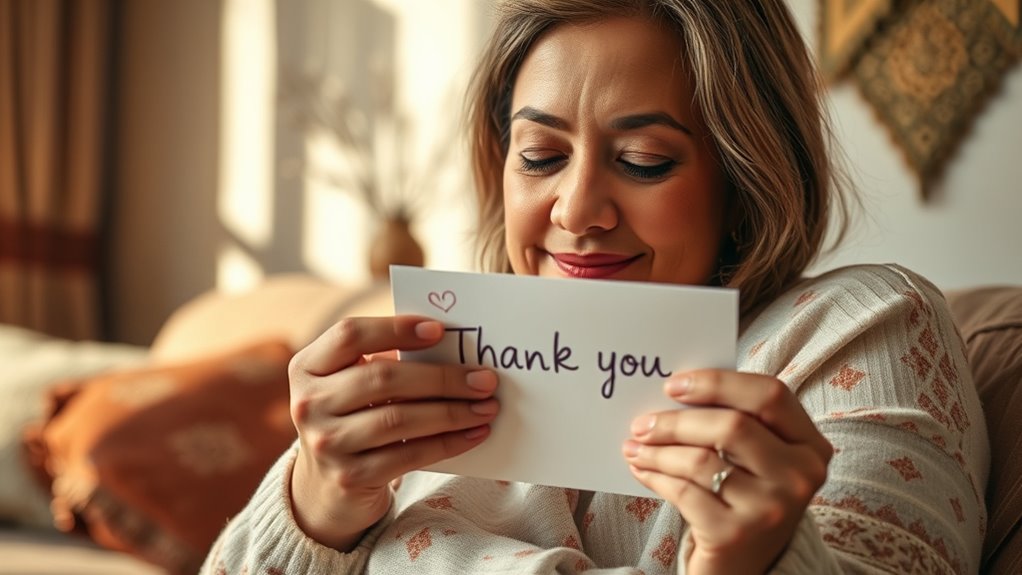 Der emotionale Tonfall beeinflusst maßgeblich, wie deine Dankesworte von deiner Mutter wahrgenommen werden. Deine Wahl an verbalen Hinweisen und Stimmungsmodulation kann Wärme, Aufrichtigkeit oder sogar Wertschätzung hervorrufen. Wenn du mit echter Emotion sprichst, kommuniziert dein Ton deine Gefühle klar und macht deine Botschaft wirkungsvoller. Umgekehrt kann ein monotoner oder zu formeller Tonfall distanziert oder unehrlich wirken, was seine Wirkung mindert. Durch bewusste Anpassung deines Tons signalisierst du herzliche Dankbarkeit und stärkst deine Verbindung. Die emotionalen Hinweise deiner Stimme helfen deiner Mutter, deine wahre Wertschätzung jenseits der Worte zu spüren. Denke daran, dass die Art und Weise, wie du etwas sagst, oft genauso wichtig ist wie das, was du sagst. Das Meistern der Tonmodulation stellt sicher, dass deine Botschaft tief resoniert und dein Dank wirklich bedeutungsvoll wird. Zusätzlich kannst du dich an lebensverändernden Zitaten von Führungspersönlichkeiten inspirieren lassen, um deine Wertschätzung mit Selbstvertrauen und Authentizität auszudrücken.